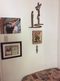 fils d’un de mes amis paroissiens qui est décédé il y a quatre mois (1), m'a invité à dîner. Patrick revient d'un voyage qui l'a conduit en Turquie. Dans la ville d'Éphèse, il y a une maison dans laquelle la Vierge Marie aurait vécu avec saint Jean et où elle serait morte (pour ceux qui croient que la Mère de Dieu a connu la mort, comme son Fils, et comme nous un jour). En visitant ce lieu, Patrick a pensé à moi qui suis un Père Oblat de la Vierge Marie. Il m'a alors acheté un souvenir que je viens d'accrocher au mur qui se trouve au pied de mon lit, dans ma chambre. Voir les photos mises un peu plus bas.